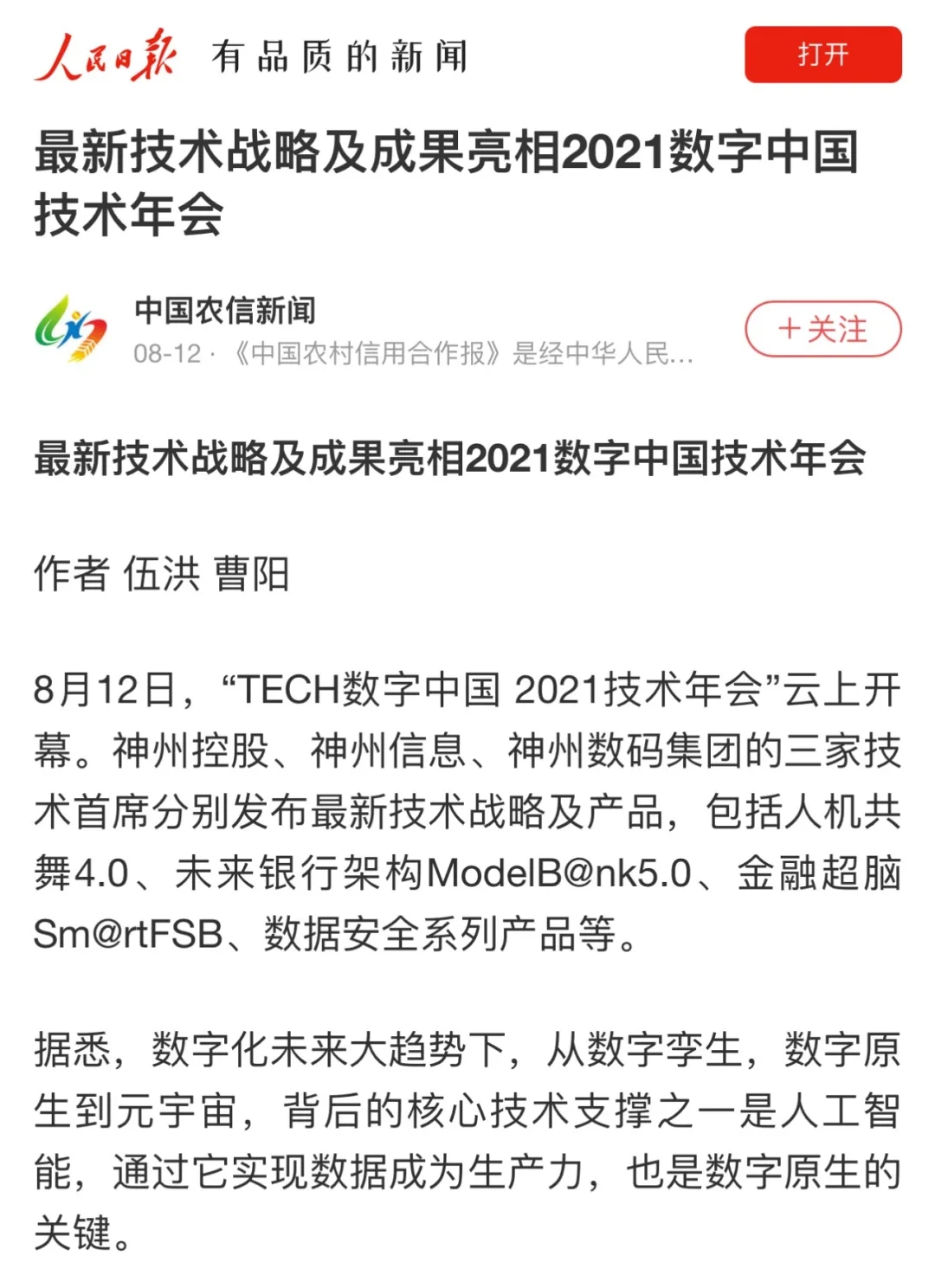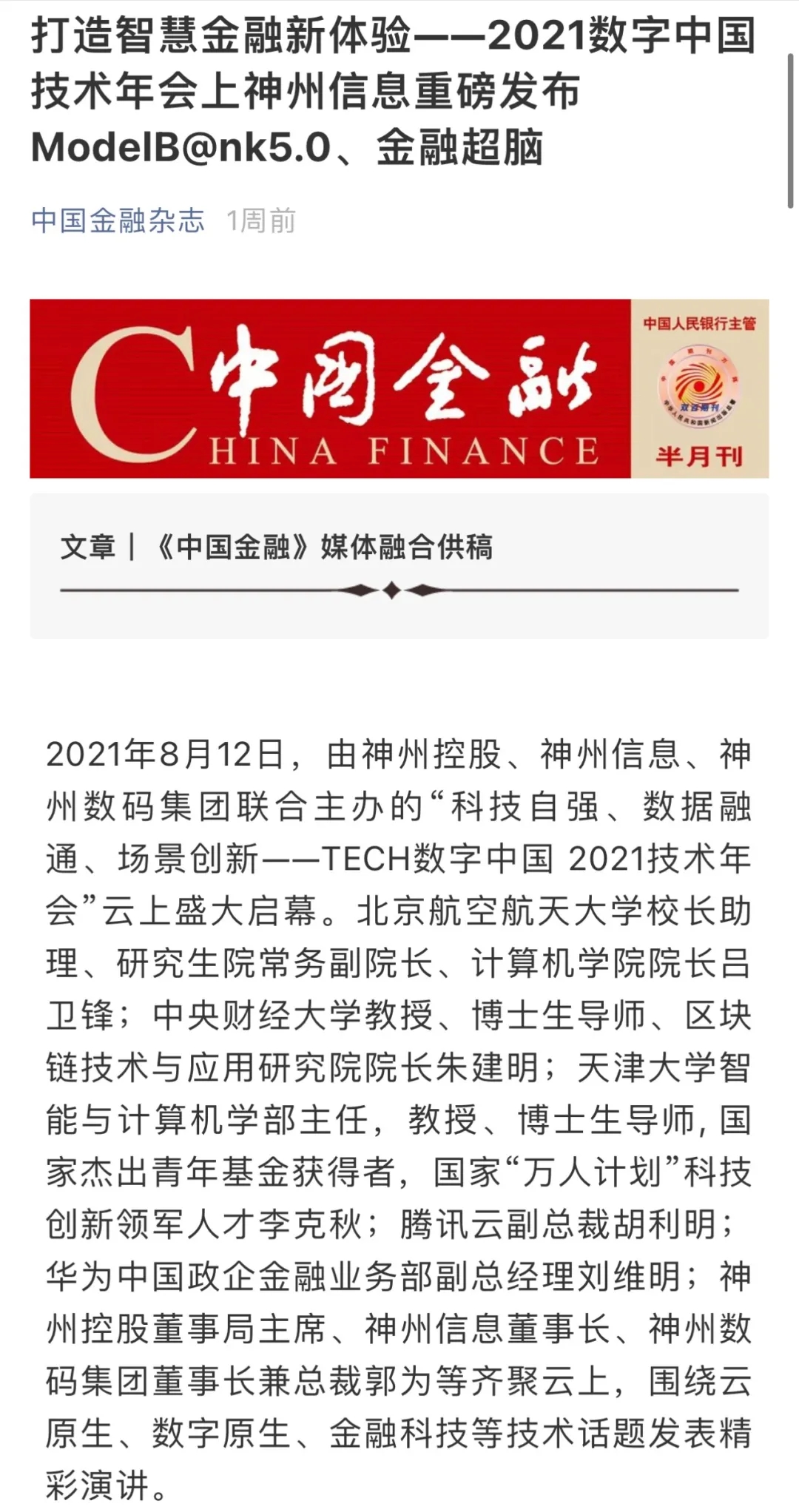 8月12日,由神州控股、BB贝博艾弗森官网、bb贝博艾弗森集团联合主办的“科技自强、数据融通、场景创新——TECH数字中国 2021技术年会”云上盛大启幕,发布神州信创云、ModelB@nk5.0、金融超脑Sm@rtFSB、云原生数字化安全底座、园区智能体等重磅产品,国内各大权威、影响力媒体多角度多频次对盛况进行报道!